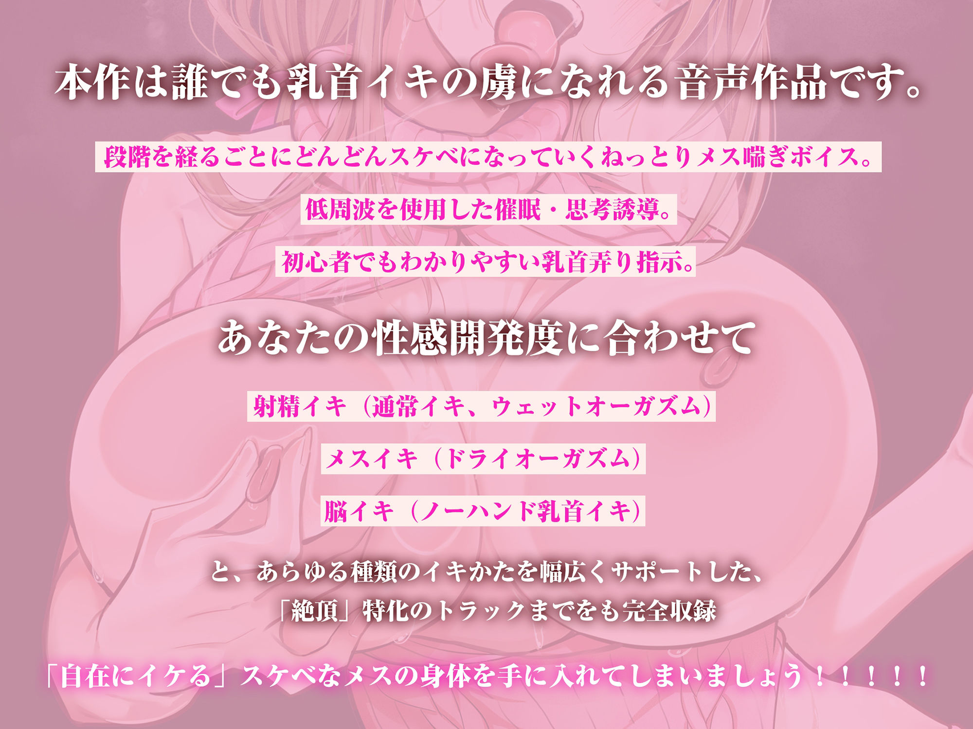 本作は「乳首開発」と「メス喘ぎ」に徹底的に特化しこだわりぬいた、誰でも乳首イキの虜になれる音声作品です。