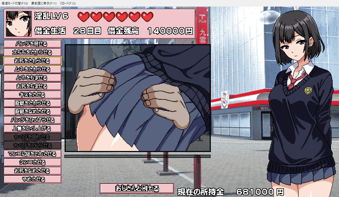 (ドットパパ活シミュレーションゲーム)借金編成の為に身体を売ってお金を稼ぐ、ボタン選択式ドット絵アニメシミュレーション。