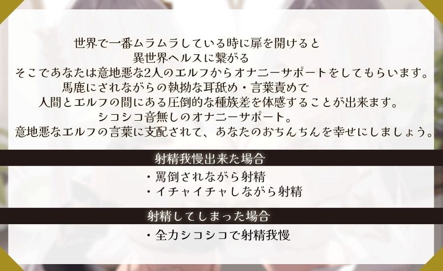 世界で一番ムラムラしているときに扉を開けると、異世界ヘルスにつながラう。そこであなたは、意地悪な2人のエルフからオナニーサポートをしてもらいます。馬鹿にされながらの執拗な耳舐め・言葉責めで人間とエルフの間にある圧倒的な種族差を体感することが出来ます。