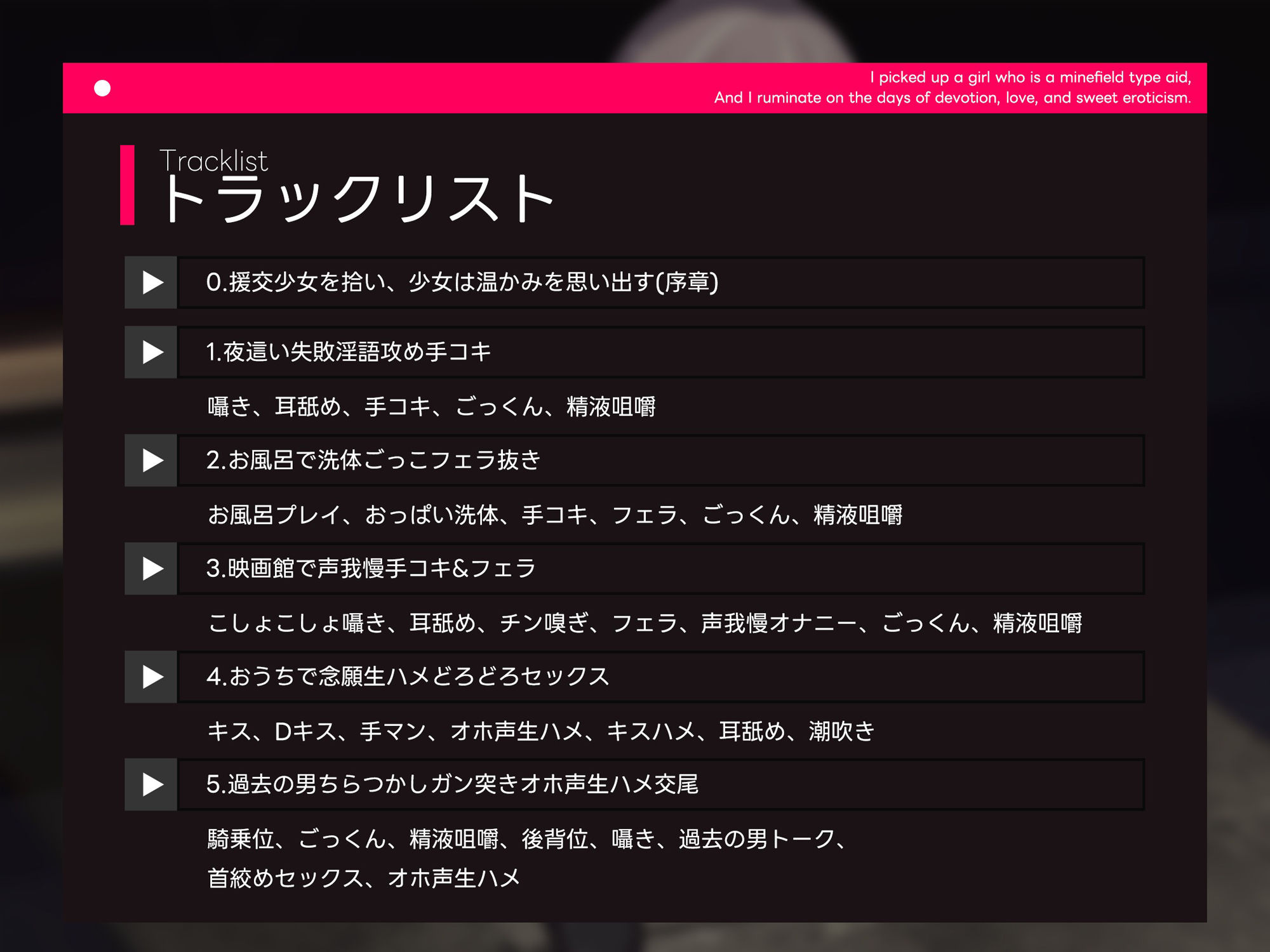 ジャンル: 中出し、フェラ、ごっくん、ラブラブ・あまあま、退廃・背徳・インモラル、色仕掛け、男性向け、成人向け、耳舐め、オホ声、年下攻め、裏垢女子