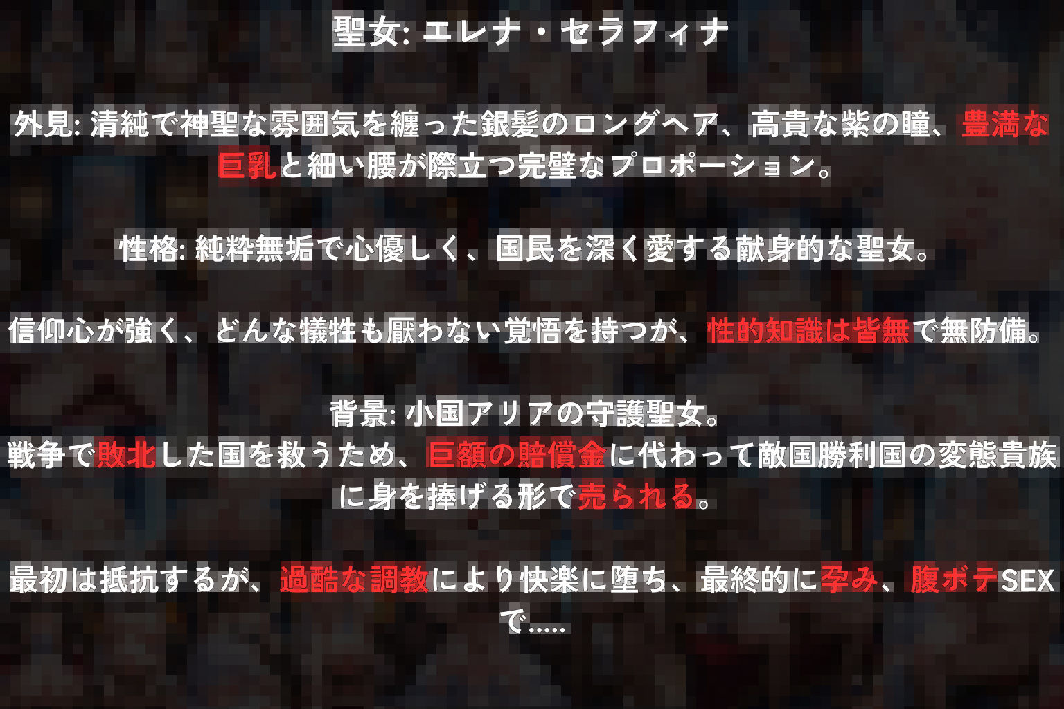 敗戦国の純潔聖女エレナが、国民を救うための賠償として、敵国の変態貴族に性奴●として売られる――。