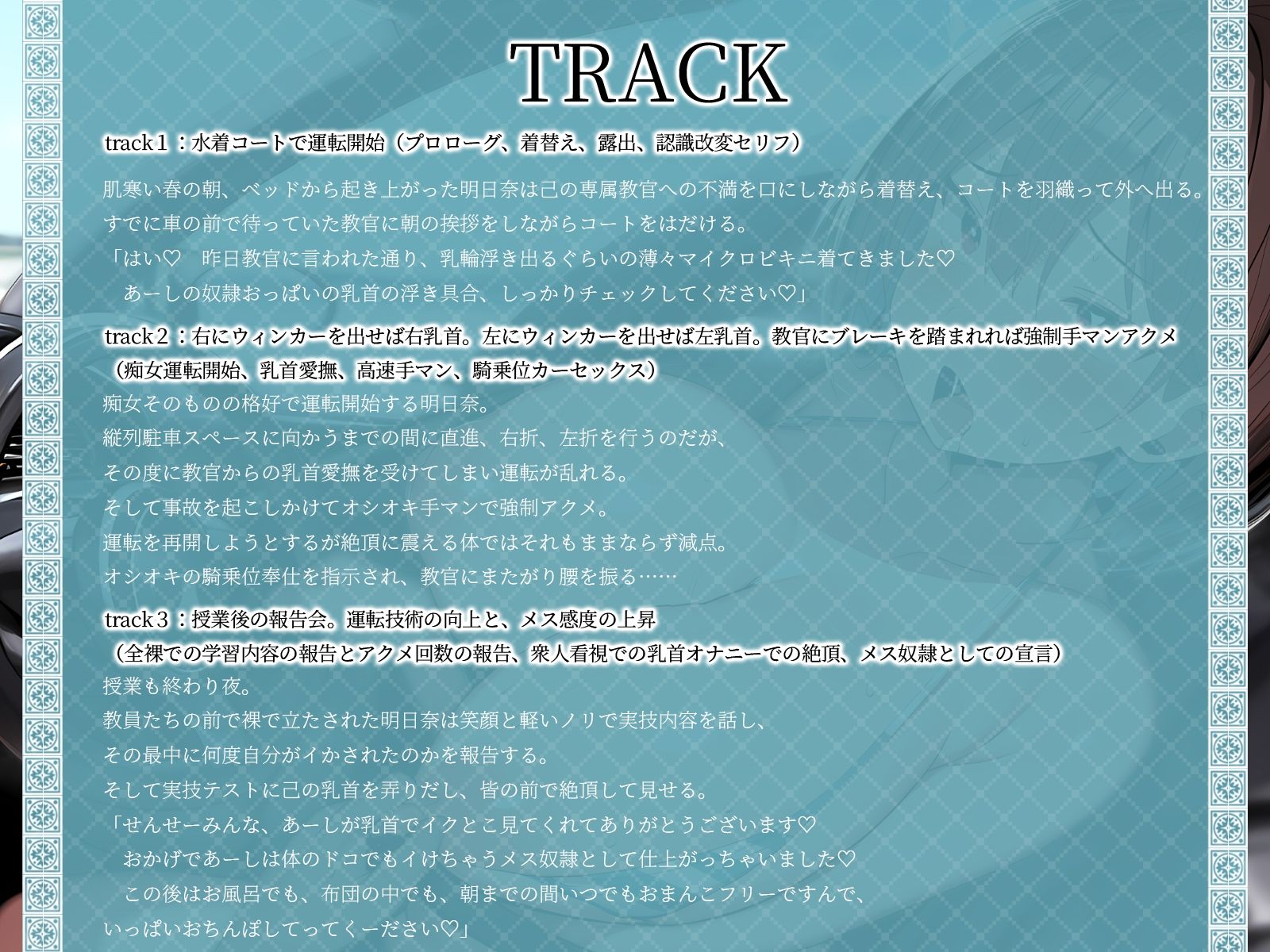 track2:右にウィンカーを出せば右乳首。左にウィンカーを出せば左乳首。教官にブレーキを踏まれれば強●手マンアクメ(痴女運転開始、乳首愛撫、高速手マン、騎乗位カーセックス)