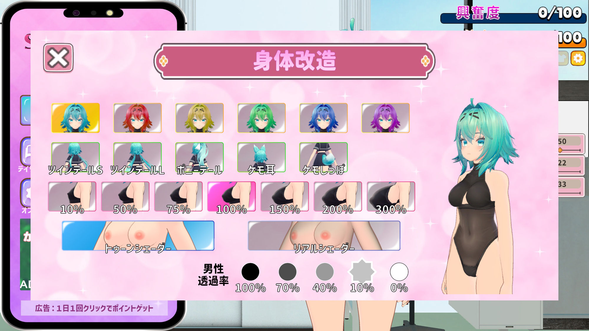 ・身体改造機能でお好みの見た目にチェンジ! (シェーダー変更、おっぱいサイズ、髪色髪型、着せ替え)
